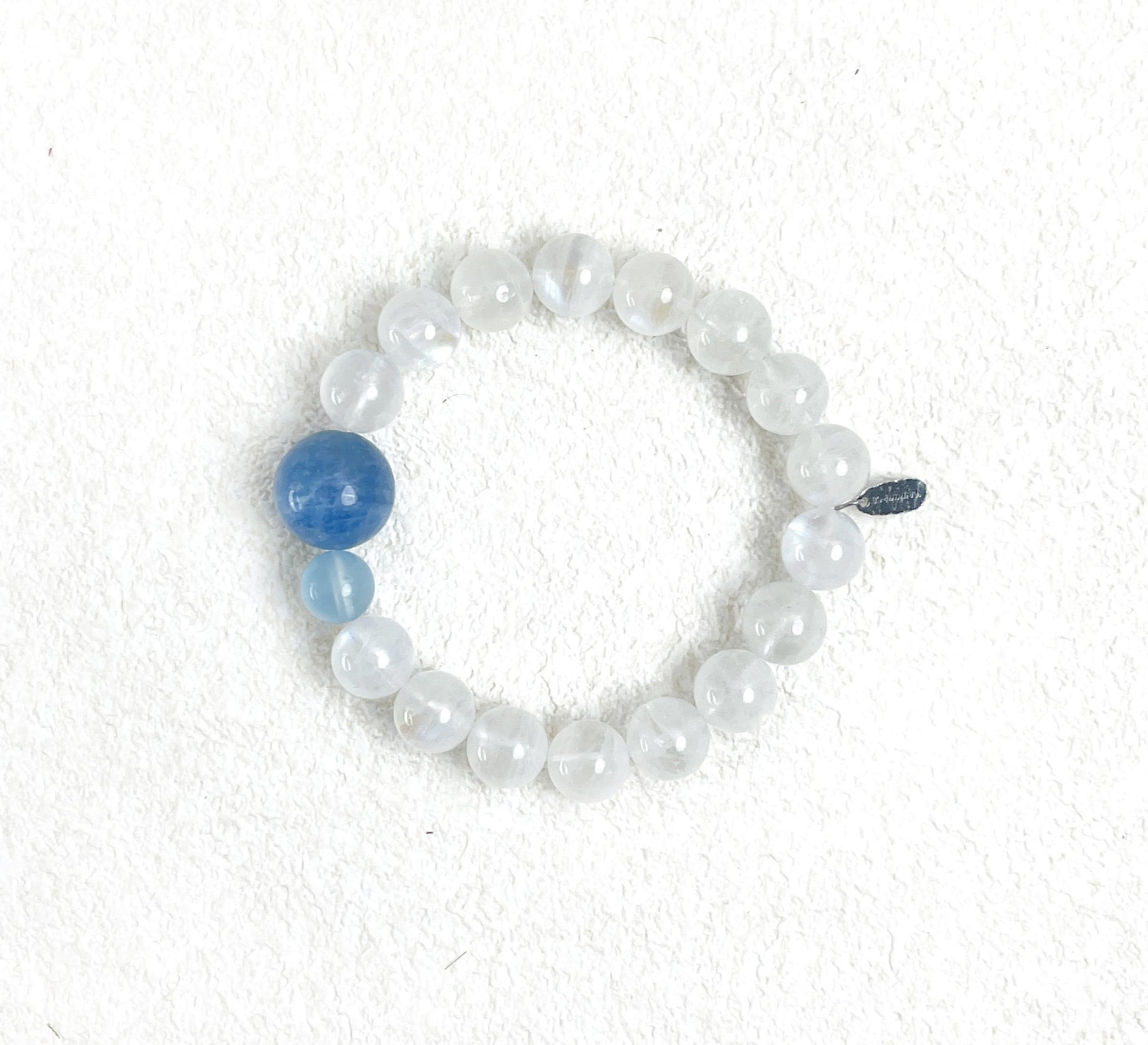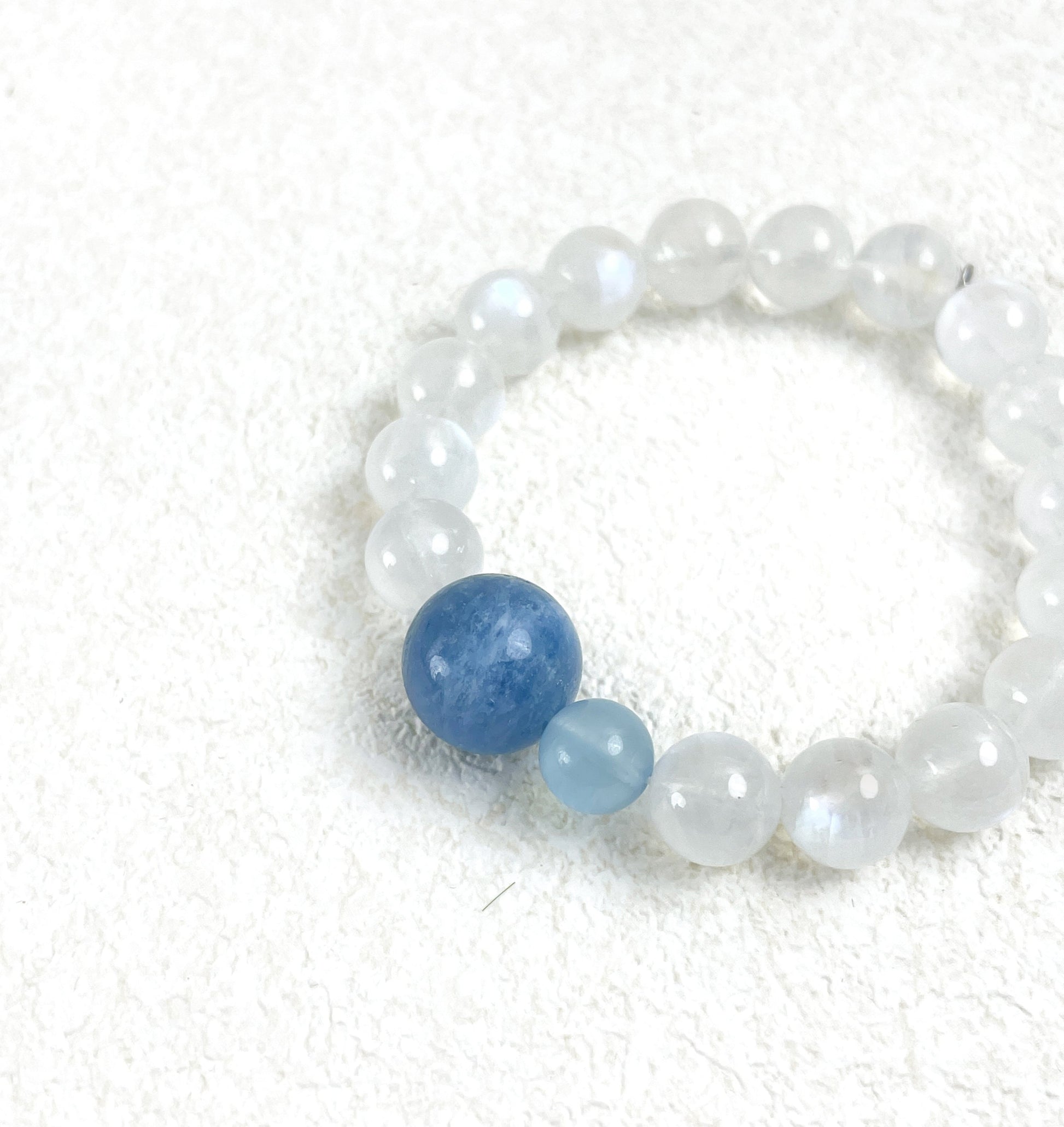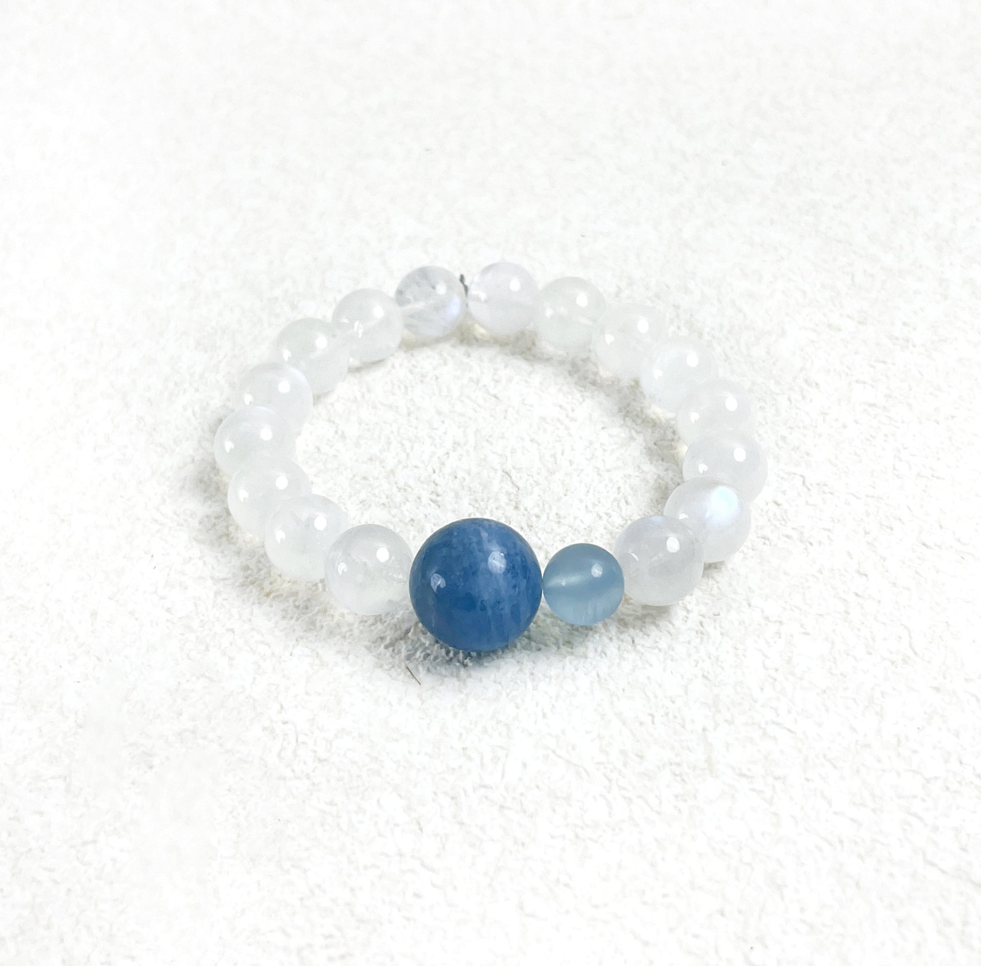 The Moonlit Sea Bracelet features a harmonious blend of 10 mm Moonstone beads and striking 13 mm Aquamarine beads, all strung on a flexible elastic cord. This elegant duo exudes a serene brilliance, evoking moonlit waters and the calm clarity of a midnight tide.