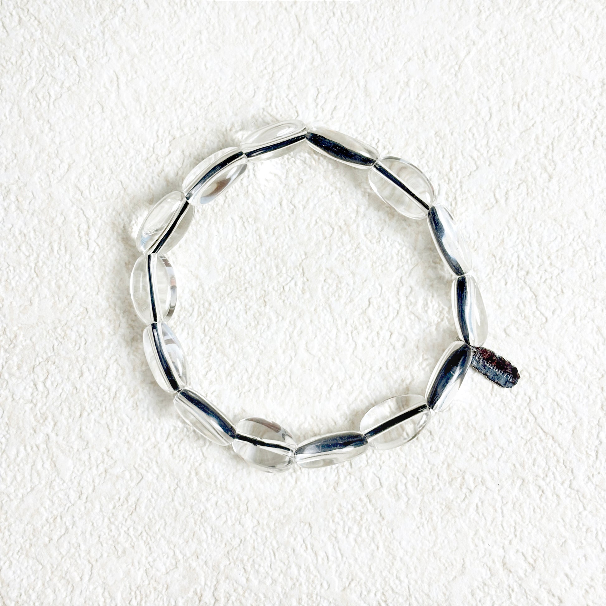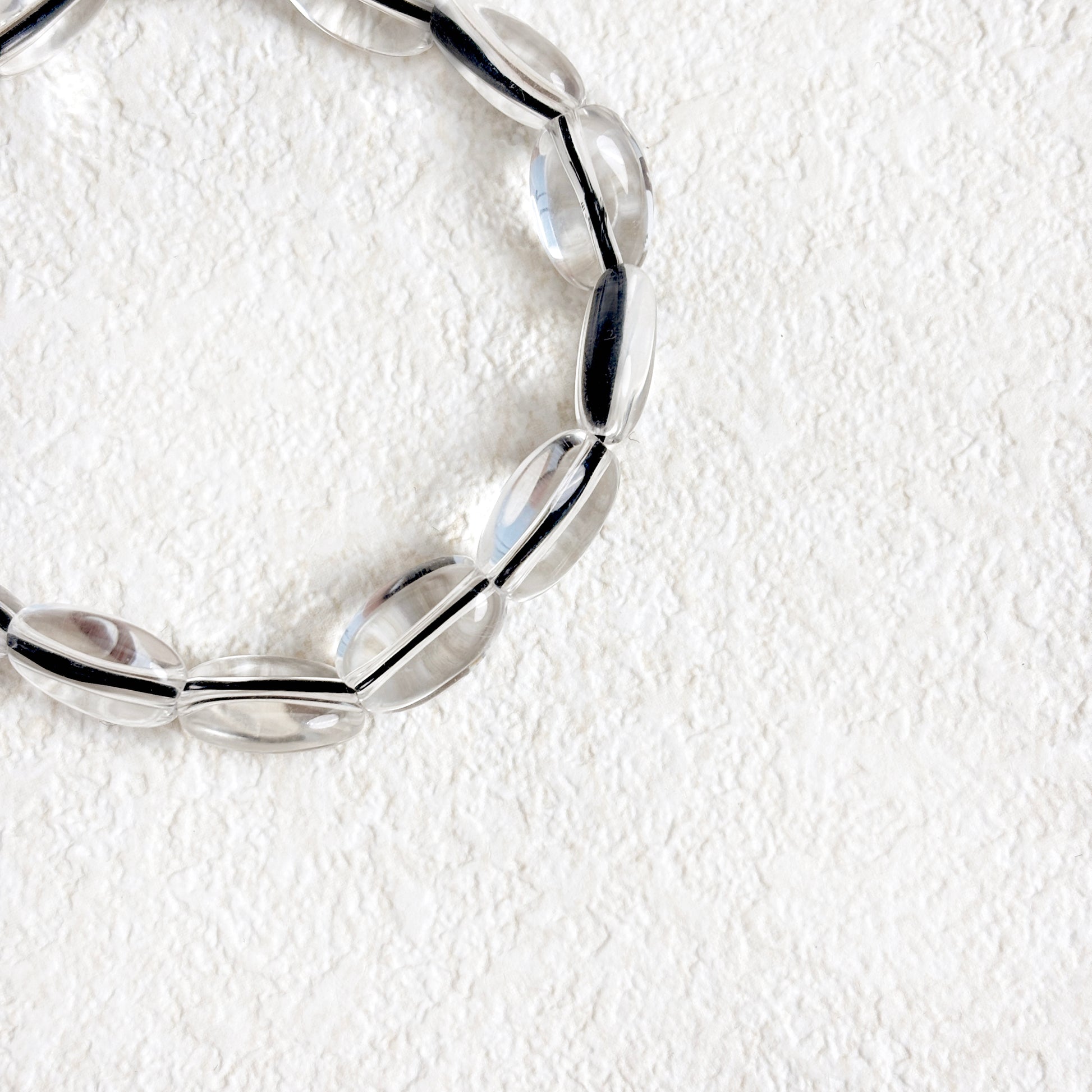 The Oval Clear Quartz Bracelet features beautifully irregular oval-shaped Clear Quartz beads, hand-strung on a stretchy elastic cord for comfort and effortless wear. Each piece is uniquely formed, with variations in color, texture, and pattern reflecting the natural charm of this masterfully crafted energy accessory.