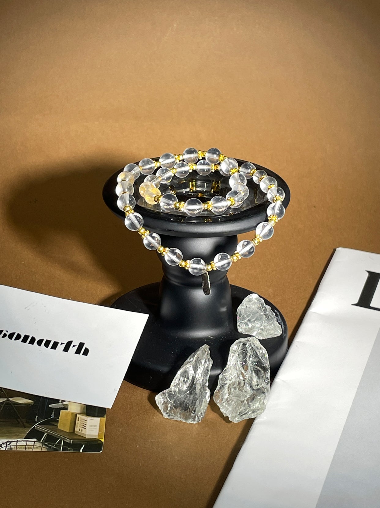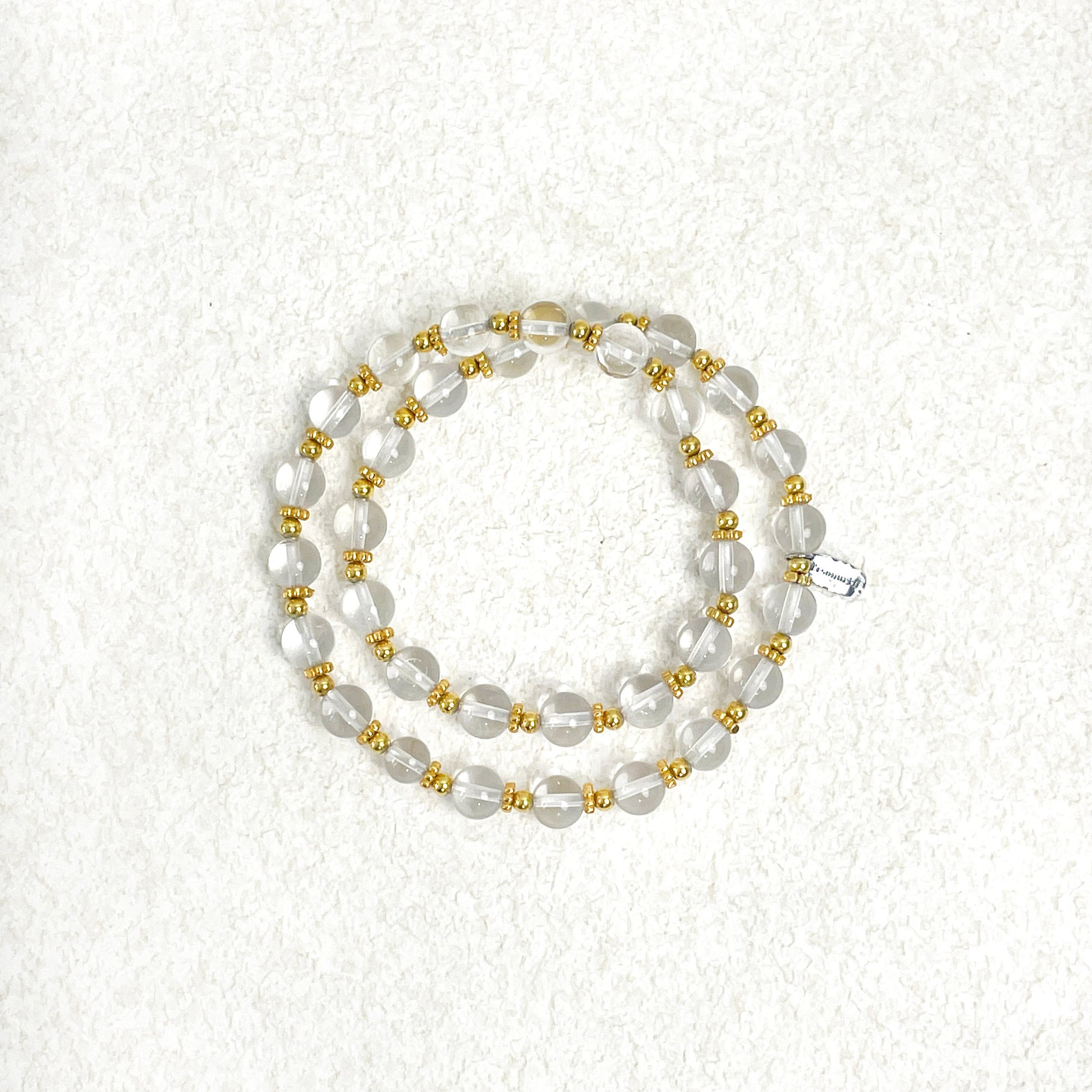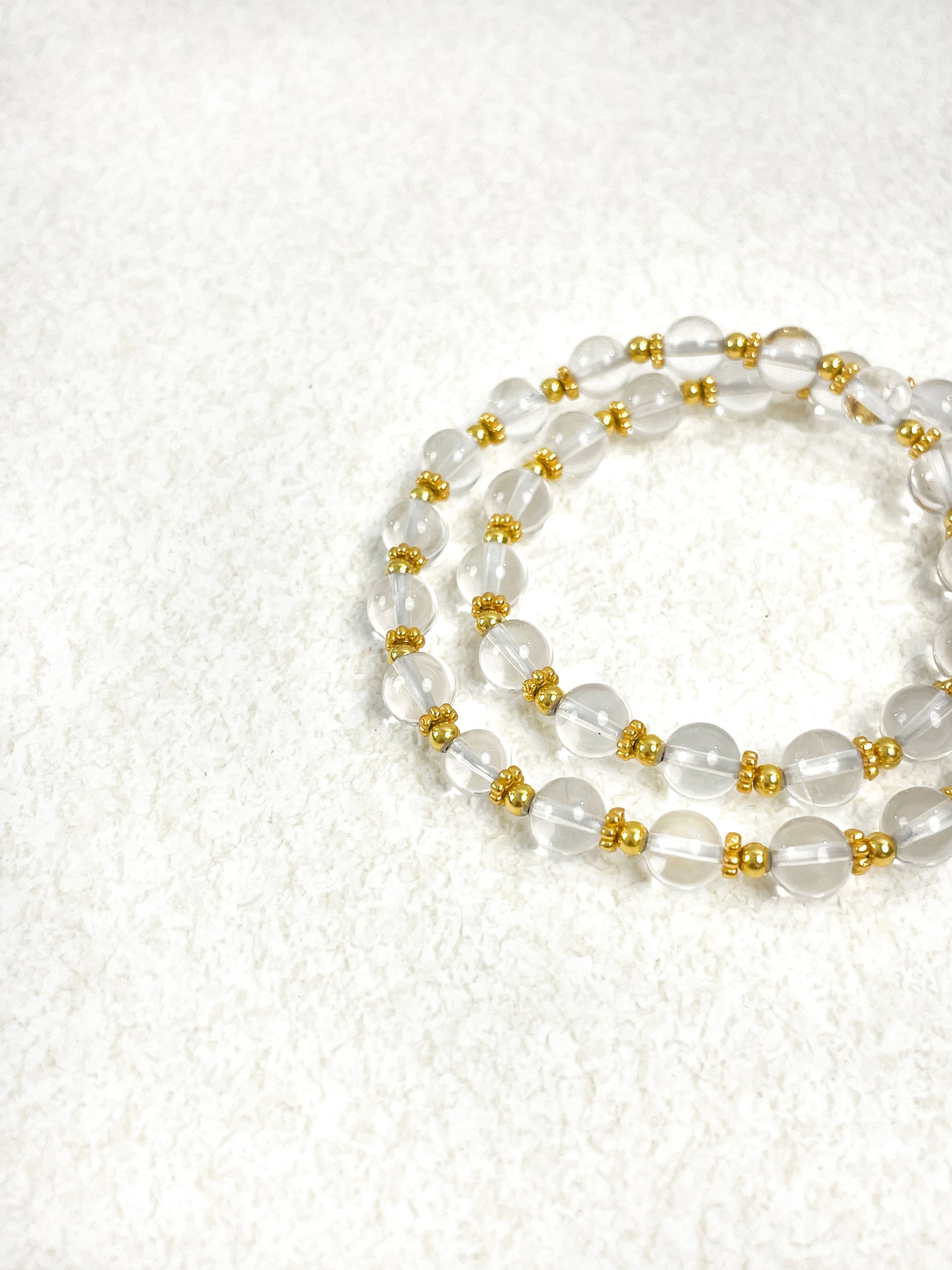 This elegant bracelet features polished clear quartz beads, strung on elastic for effortless everyday wear. The purity and simplicity of its design evoke the feeling of a bright new dawn—clean, luminous, and full of possibility.