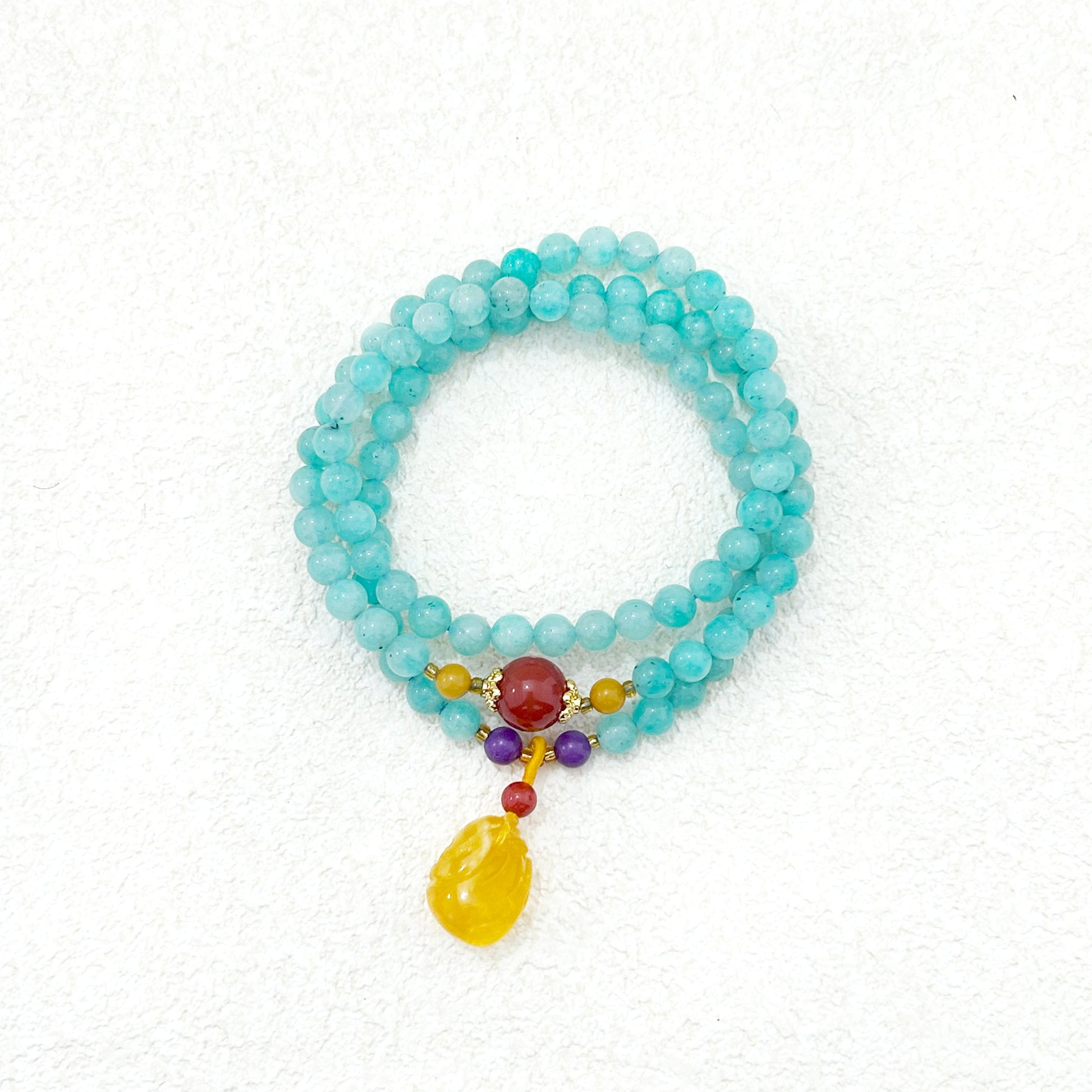 This graceful bracelet combines soothing Amazonite, grounding Red Agate, warm Amber, and gentle Lepidolite, strung on elastic for comfortable wear. Its refreshing color palette evokes the calm, renewing energy that follows a summer rain at sea—balancing vitality, clarity, and emotional peace.