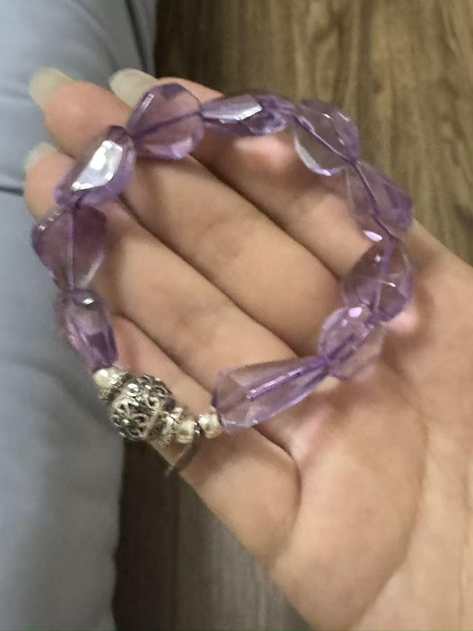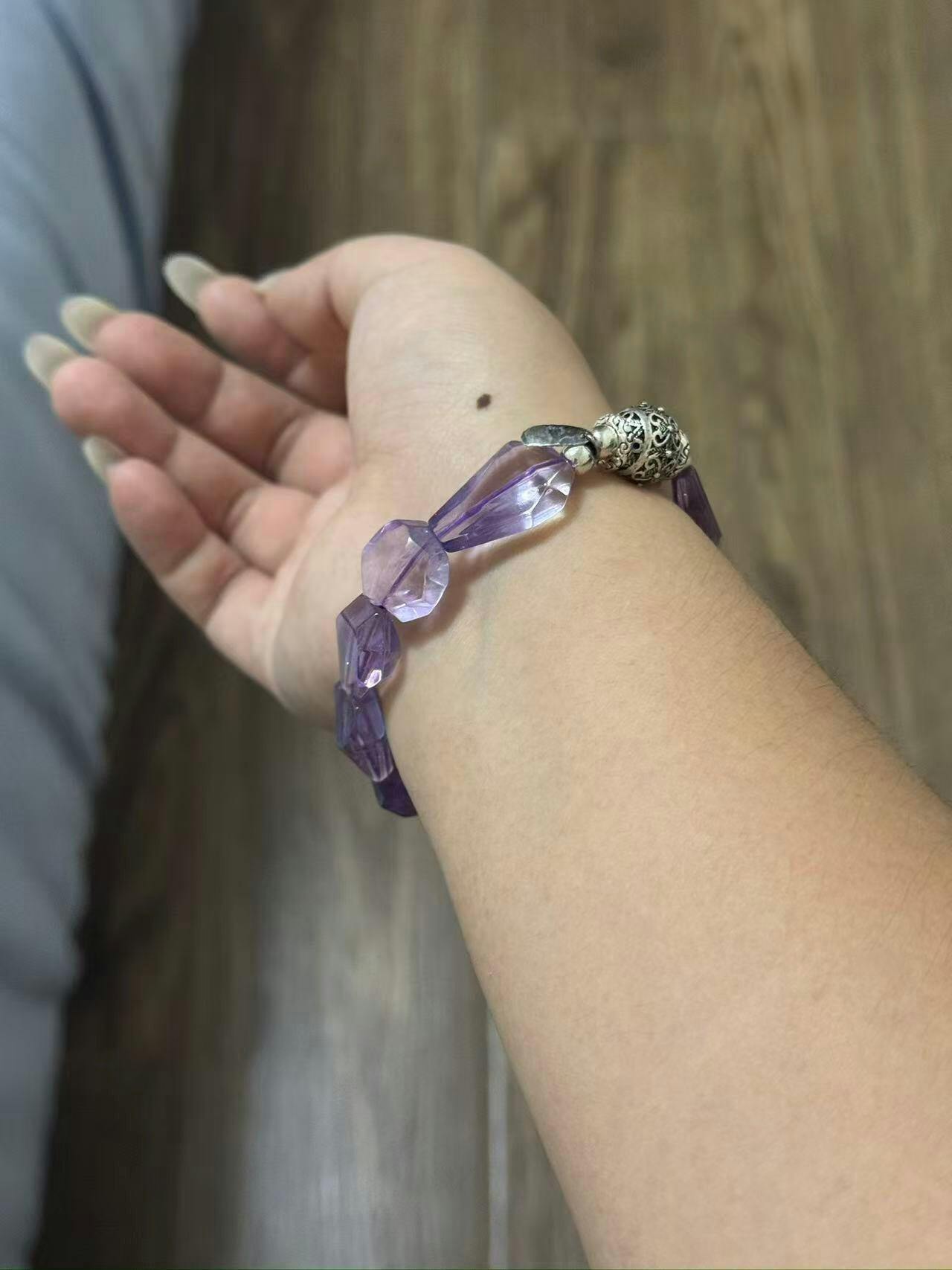 The Stardrop Silence Bracelet showcases organically shaped amethyst beads coupled with elegant sterling silver accents, strung on a flexible elastic cord for comfortable, everyday wear. Each bead’s unique form and texture make every bracelet one-of-a-kind, a personal reflection of beauty and natural serenity.