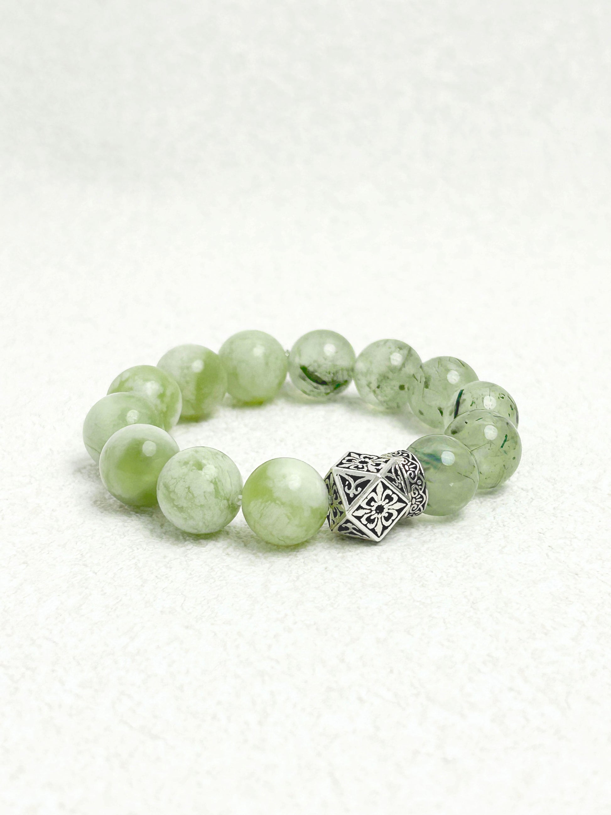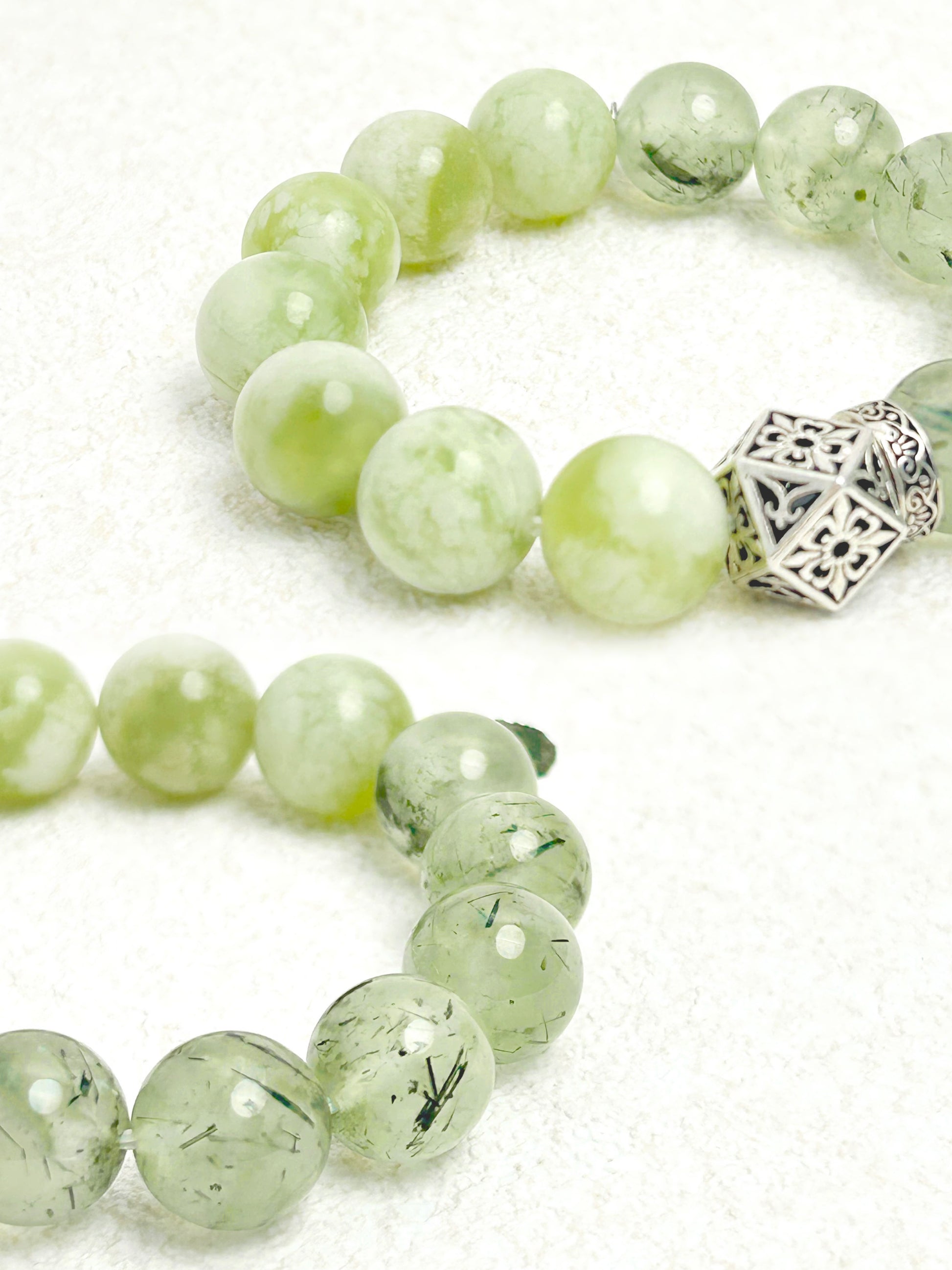 The Verdant Veil Bracelet features generously sized 12 mm Serpentine Jade and 12 mm Prehnite beads, elegantly strung on flexible elastic with subtle silver accents for comfortable, everyday wear. Its lush shades of green evoke the peaceful serenity of forest canopies, offering both aesthetic softness and soulful calm.